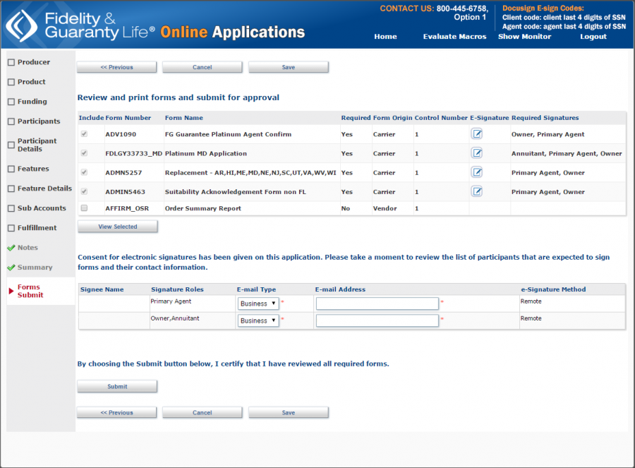 - Ensure that the proper email address is added for both agent and owner/annuitant and then click the submit button.